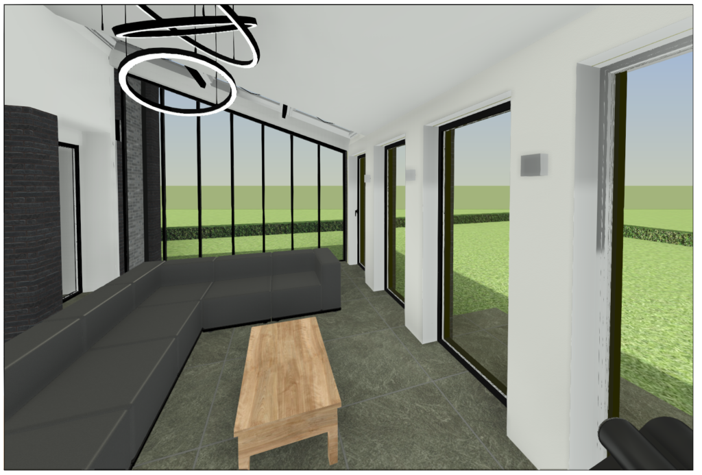 Mede door de zonnepanelen is het huis primair noord- zuid gericht. De overstekken zijwaarts zijn afgestemd op ‘standaard’ zonnepanelen afmetingen. Direct zonlicht in woonruimte wordt vermeden door een forse overstek en door zeer smalle ramen op het zuiden. Dit om de invloed van zomerse warmte binnen te beperken. De wanden en daken zijn goed geïsoleerd.