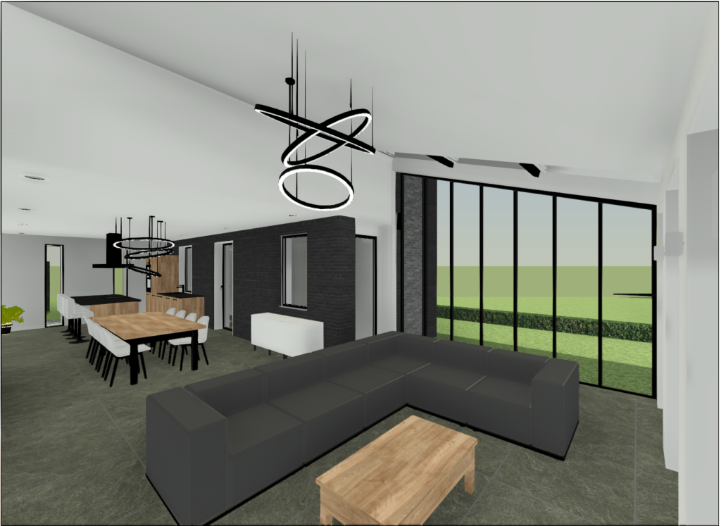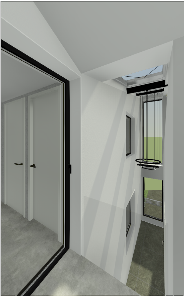 Centraal binnen het ontwerp is de hal welke als binnen/buiten ‘straat’ de ruimtes verbindt. Glas wordt bij de wanden en dak van de hal toegepast voor veel daglichttoetreding. Er zijn meerdere interne ramen en transparante deuren welke voor indirect lichttoetreding zorgen. De woonruimte omvat een open keuken met een kookeiland. Er is rechtstreeks contact met het eet- en zitgedeelte. De glazen wand van de hal komt terug in het zitgedeelte, waardoor een extra verbinding met de buitentuin aanwezig is. Boven is er ruimte voor drie slaapkamers, een badkamer en een separaat toilet. De master slaapkamer heeft een eigen badkamer en een inloopkast. Een derde etage voor met name opslag is facultatief.