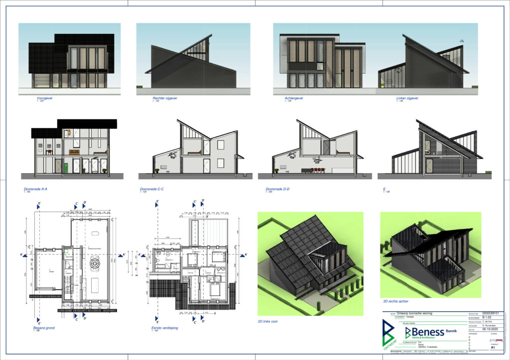 Eigenzinnig tijdloos ontwerp waarbij gebruikelijke bouwelementen verwisseld zijn. Zoals bijvoorbeeld de goot en nok in de massa, en ramen en penanten in de façades.